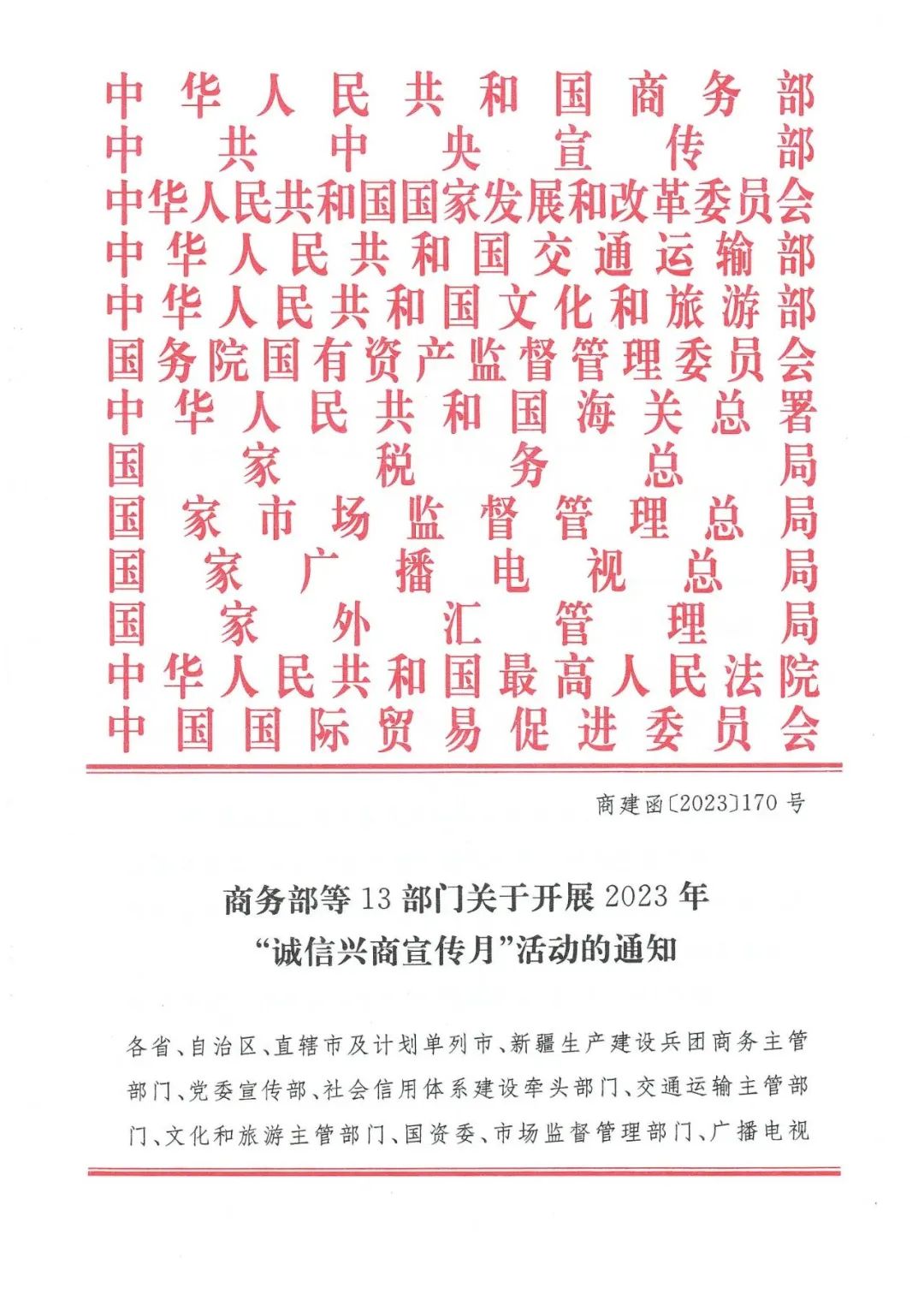 為全面貫徹黨的二十大和中央經(jīng)濟(jì)工作會議精神,深入落實(shí)黨中央、國務(wù)院關(guān)于推動社會信用體系高質(zhì)量發(fā)展的決策部署,積極推廣誠信理念、弘揚(yáng)誠信文化,持續(xù)推動各行業(yè)領(lǐng)域形成誠信公約,營造良好的營商環(huán)境和消費(fèi)環(huán)境,商務(wù)部、中央宣傳部等13部門定于2023年9月開展“誠信興商宣傳月”活動(以下簡稱宣傳月活動)。現(xiàn)將有關(guān)事項(xiàng)通知如下:
