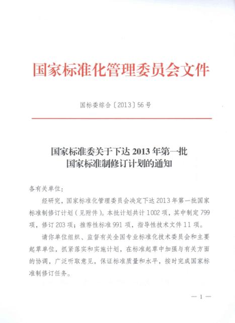 經(jīng)研究,國(guó)家標(biāo)準(zhǔn)化管理委員會(huì)決定下達(dá)2013年第一批國(guó)家標(biāo)準(zhǔn)制修訂計(jì)劃(見(jiàn)附件)。本批計(jì)劃共計(jì)1002項(xiàng),其中制定799項(xiàng),修訂203項(xiàng);推薦性標(biāo)準(zhǔn)991項(xiàng),指導(dǎo)性技術(shù)文件11項(xiàng)。
