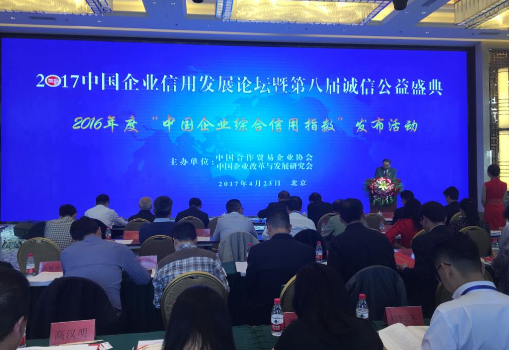 2017年4月23日,由中國合作貿(mào)易企業(yè)協(xié)會(huì)、中國企業(yè)改革與發(fā)展研究會(huì)聯(lián)合主辦的“2017中國企業(yè)信用發(fā)展論壇暨第八屆誠信公益盛典”在京隆重召開。國家發(fā)改委、商務(wù)部、工信部、國務(wù)院國資委、國務(wù)院研究室、國務(wù)院發(fā)展研究中心、國家質(zhì)檢總局、聯(lián)合國工發(fā)組織等有關(guān)領(lǐng)導(dǎo)、知名專家學(xué)者,以及中國企業(yè)信用500強(qiáng)部分代表和誠信企業(yè)、企業(yè)家代表約200多人參加了本次論壇。