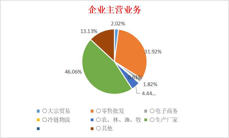 企業(yè)主營業(yè)務以零售批發(fā)(31.92%)、生產(chǎn)廠家(46.06%)為主,以及大宗貿(mào)易(2.02%)、農(nóng)林漁牧(4.44%)、電子商務(1.82%)、冷鏈物流(0.61%),其它(13.13%)。