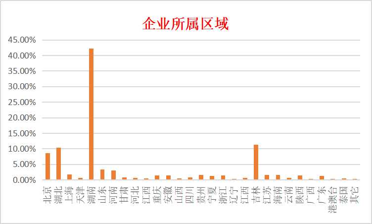 從省份分布上,共有26個省份企業(yè)參與,主要是北京(8.69%)、湖北(10.30%)、上海(1.82%)、天津(0.61%)、湖南(42.22%)、山東(3.43%)、河南(3.03%)、甘肅(0.81%)、河北(0.61%)、江西(0.2%)、重慶(1.41%)、安徽(1.41%)、山西(0.2%)、四川(0.81%)、貴州(1.62%)、寧夏(1.21%)、浙江(1.41%)、遼寧(0.4%)、江西(0.61%)、吉林(11.31%)、江蘇(1.62%)、海南(1.62%)、云南(0.61%)、陜西(1.41%)、廣西(0.4%)、廣東(1.21%)等。