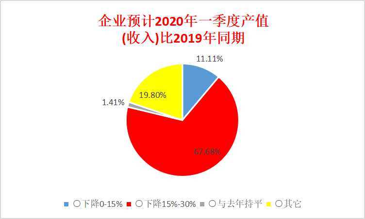 對于2020年企業(yè)一季度營收和經(jīng)營情況的預估,受訪企業(yè)持觀望態(tài)度,認為企業(yè)經(jīng)營目前陷入等待期,營收將受到很大程度的影響。預計2020年一季度產(chǎn)值(收入)比2019年同期,55家企業(yè)下降0-15%(11.11%),335家企業(yè)下降15%-30%(67.68%),7家企業(yè)與去年持平(1.41%),98家企業(yè)為其它(19.80%)。以上營收預判,將明顯影響企業(yè)的效益,使得生存壓力變大。