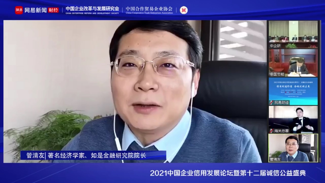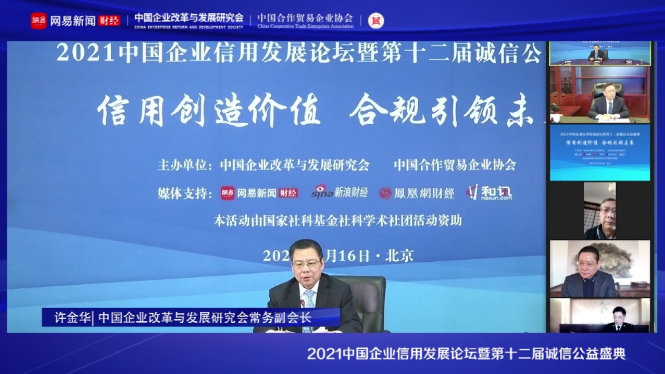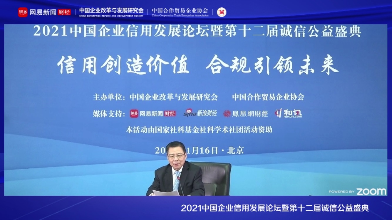 1月16日,“2021中國(guó)企業(yè)信用發(fā)展論壇暨第十二屆誠(chéng)信公益盛典”在京隆重召開(kāi)。本次論壇由中國(guó)企業(yè)改革與發(fā)展研究會(huì)、中國(guó)合作貿(mào)易企業(yè)協(xié)會(huì)主辦,由國(guó)信聯(lián)合(北京)認(rèn)證中心承辦,由國(guó)家社科基金社科學(xué)術(shù)團(tuán)體活動(dòng)資助,網(wǎng)易財(cái)經(jīng)、新浪財(cái)經(jīng)、鳳凰財(cái)經(jīng)、和訊財(cái)經(jīng)、企業(yè)觀察報(bào)作為媒體支持。中國(guó)企業(yè)改革與發(fā)展研究會(huì)常務(wù)副會(huì)長(zhǎng)許金華,中國(guó)節(jié)能環(huán)保集團(tuán)有限公司黨委書記、董事長(zhǎng)宋鑫,海關(guān)總署國(guó)際檢驗(yàn)檢疫標(biāo)準(zhǔn)與技術(shù)法規(guī)研究中心副主任趙明剛,中國(guó)合作貿(mào)易企業(yè)協(xié)會(huì)副會(huì)長(zhǎng)兼秘書長(zhǎng)高景遠(yuǎn),中國(guó)企業(yè)改革與發(fā)展研究會(huì)常務(wù)副秘書長(zhǎng)李華,山西杏花村汾酒集團(tuán)有限責(zé)任公司黨委書記、董事長(zhǎng)李秋喜,著名經(jīng)濟(jì)學(xué)家、華夏新供給經(jīng)濟(jì)學(xué)研究院院長(zhǎng)賈康,著名經(jīng)濟(jì)學(xué)家、如是金融研究院院長(zhǎng)管清友,中國(guó)人民大學(xué)財(cái)政金融學(xué)院教授、信用管理學(xué)科帶頭人吳晶妹,中國(guó)企業(yè)改革與發(fā)展研究會(huì)信用委員會(huì)主任、中國(guó)合作貿(mào)易企業(yè)協(xié)會(huì)金融與信用委員會(huì)主任劉棟棟出席論壇。2020年度中國(guó)企業(yè)信用500強(qiáng)代表、誠(chéng)信企業(yè)和企業(yè)家代表通過(guò)線上方式觀看視頻直播。