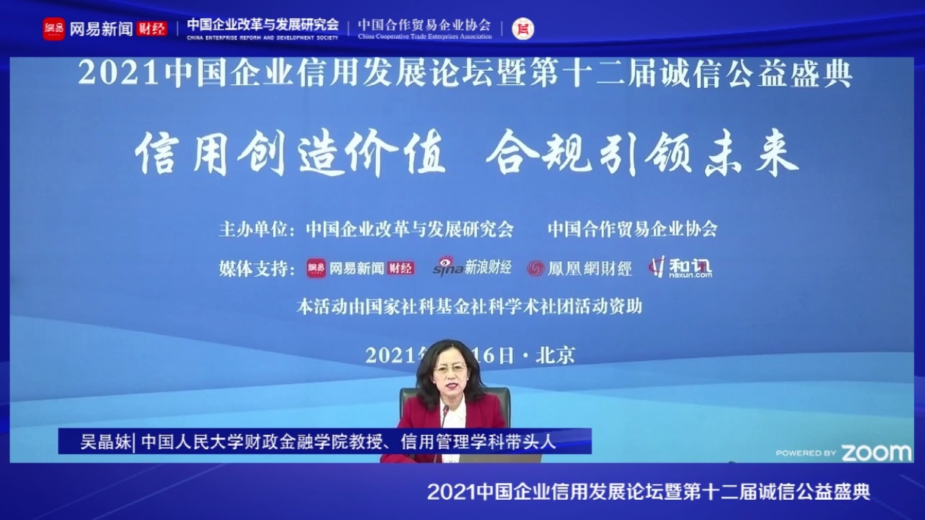 中國(guó)人民大學(xué)財(cái)政金融學(xué)院教授、信用管理學(xué)科帶頭人吳晶妹圍繞《推進(jìn)社會(huì)信用體系高質(zhì)量發(fā)展、實(shí)現(xiàn)企業(yè)信用建設(shè)提質(zhì)增效》作主題演講。吳晶妹教授表示,企業(yè)在社會(huì)信用體系建設(shè)中大有可為。面對(duì)新的形勢(shì)與政策要求,企業(yè)如何把握機(jī)遇,提升自己的信用資本,實(shí)現(xiàn)企業(yè)信用價(jià)值,吳晶妹教授給出了六條具體建議。第一,加強(qiáng)學(xué)習(xí),加快提升企業(yè)信用管理水平;第二,完善企業(yè)管理,在管理層面設(shè)立信用管理委員會(huì);第三,有一定規(guī)模的企業(yè),可以考慮設(shè)置信用管理師崗位;第四,有一定條件的企業(yè),可以考慮聘請(qǐng)外部專家作為企業(yè)信用管理顧問(wèn);第五,協(xié)會(huì)、商會(huì)等行業(yè)組織,可以考慮建立信用服務(wù)工作組,幫助中小企業(yè)、小微企業(yè)、個(gè)體工商戶降低信用管理提升的成本;第六,大企業(yè)供應(yīng)鏈的核心企業(yè),可以考慮多參與社會(huì)信用體系建設(shè),在履行企業(yè)社會(huì)責(zé)任的同時(shí)獲得企業(yè)應(yīng)得的收益。