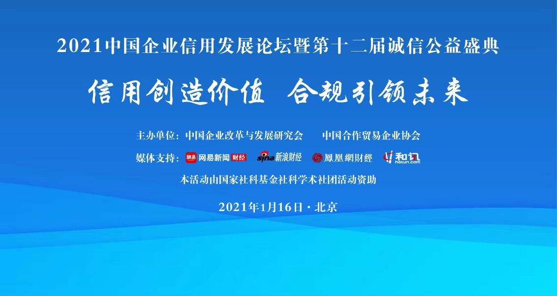 1月16日,“2021中國企業(yè)信用發(fā)展論壇暨第十二屆誠信公益盛典”在京隆重召開。本次論壇由中國企業(yè)改革與發(fā)展研究會、中國合作貿(mào)易企業(yè)協(xié)會主辦,由國信聯(lián)合(北京)認(rèn)證中心承辦,由國家社科基金社科學(xué)術(shù)團(tuán)體活動資助,網(wǎng)易財(cái)經(jīng)、新浪財(cái)經(jīng)、鳳凰財(cái)經(jīng)、和訊財(cái)經(jīng)、企業(yè)觀察報(bào)作為媒體支持。中國企業(yè)改革與發(fā)展研究會常務(wù)副會長許金華,中國節(jié)能環(huán)保集團(tuán)有限公司黨委書記、董事長宋鑫,海關(guān)總署國際檢驗(yàn)檢疫標(biāo)準(zhǔn)與技術(shù)法規(guī)研究中心副主任趙明剛,中國合作貿(mào)易企業(yè)協(xié)會副會長兼秘書長高景遠(yuǎn),中國企業(yè)改革與發(fā)展研究會常務(wù)副秘書長李華,山西杏花村汾酒集團(tuán)有限責(zé)任公司黨委書記、董事長李秋喜,著名經(jīng)濟(jì)學(xué)家、華夏新供給經(jīng)濟(jì)學(xué)研究院院長賈康,著名經(jīng)濟(jì)學(xué)家、如是金融研究院院長管清友,中國人民大學(xué)財(cái)政金融學(xué)院教授、信用管理學(xué)科帶頭人吳晶妹,中國企業(yè)改革與發(fā)展研究會信用委員會主任、中國合作貿(mào)易企業(yè)協(xié)會金融與信用委員會主任劉棟棟出席論壇。2020年度中國企業(yè)信用500強(qiáng)代表、誠信企業(yè)和企業(yè)家代表通過線上方式觀看視頻直播。