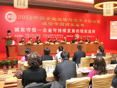 2010年1月24日,由中國(guó)合作貿(mào)易企業(yè)協(xié)會(huì)、中國(guó)企業(yè)改革與發(fā)展研究會(huì)等單位共同主辦的“2010中國(guó)企業(yè)誠(chéng)信與競(jìng)爭(zhēng)力論壇”在北京舉行,論壇主題為誠(chéng)實(shí)守信——企業(yè)可持續(xù)發(fā)展的現(xiàn)實(shí)選擇。論壇對(duì)2010年最新中國(guó)宏觀經(jīng)濟(jì)政策進(jìn)行了解析,并圍繞“企業(yè)誠(chéng)信建設(shè)與市場(chǎng)競(jìng)爭(zhēng)力”、“ 低碳經(jīng)濟(jì):企業(yè)社會(huì)責(zé)任履行與增長(zhǎng)方式的轉(zhuǎn)型”、 “品牌與誠(chéng)信體系建設(shè)”、“誠(chéng)信興企”等問題進(jìn)行了探討。