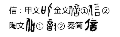 在陶文中“信”也有兩形寫法,其中陶文①形從人從口,明顯傳承自甲文。陶文②形從人從言,明顯傳承自金文。秦簡(jiǎn)“信”主要從金文傳承而來(lái),是后世“信”的直接源頭。