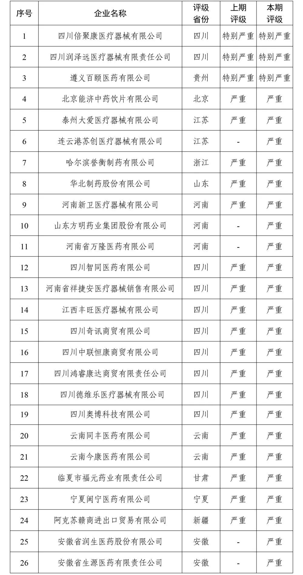 11月20日,國家醫(yī)保局醫(yī)藥價格和招標采購指導中心發(fā)布了各省份評級為“特別嚴重”和“嚴重”失信的26家醫(yī)藥企業(yè)情況,其中23家醫(yī)藥企業(yè)評級為“嚴重”,3家醫(yī)藥企業(yè)評級為“特別嚴重”。