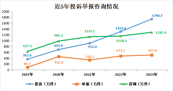 2023年,全國市場監(jiān)管部門通過全國12315平臺、電話、傳真、窗口等渠道共受理消費(fèi)者投訴、舉報(bào)和咨詢3534.3萬件,同比增長20.2%。其中,投訴1740.3萬件,舉報(bào)507萬件;為消費(fèi)者挽回經(jīng)濟(jì)損失44.9億元,有力地保護(hù)了消費(fèi)者的合法權(quán)益。主要呈現(xiàn)八大特點(diǎn):