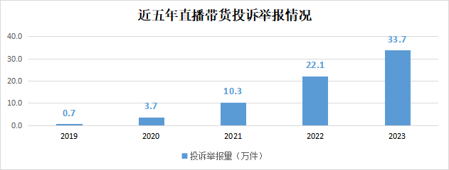 2023年,全國12315平臺接收網(wǎng)購?fù)对V舉報(bào)1261.1萬件,占投訴舉報(bào)總量的56.1%,以直播電商為主的新興電商投訴舉報(bào)增幅明顯高于傳統(tǒng)電商平臺。近年來,直播電商規(guī)模迎來爆發(fā)式增長,近5年直播電商市場規(guī)模增長了10.5倍,直播帶貨投訴舉報(bào)量也逐年上升,5年間增幅高達(dá)47.1倍。平臺接收直播帶貨投訴舉報(bào)33.7萬件,同比增長52.5%,排名前三的問題分別是售后服務(wù)(7.3萬件)、質(zhì)量問題(6.2萬件)、不正當(dāng)競爭(4.5萬件),增長最快的問題是不正當(dāng)競爭,同比增長2倍。消費(fèi)者反映的問題主要集中在購買的商品為“三無”產(chǎn)品、到手商品與直播間展示商品性能不一致、退換貨困難等。
