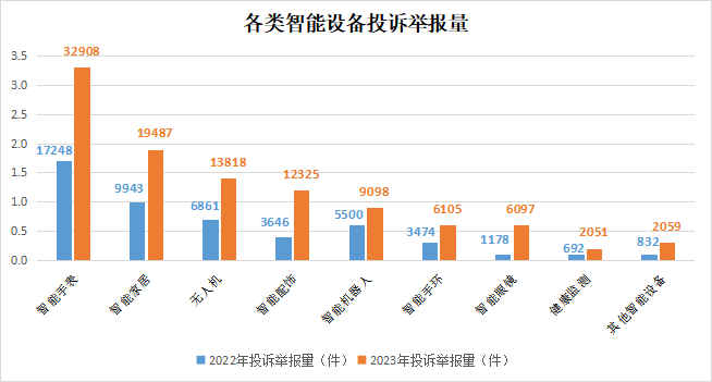 隨著物聯(lián)網(wǎng)、人工智能、5G通信等技術(shù)的突破,智能設(shè)備不斷更新迭代。各類可穿戴智能設(shè)備、智能家居越來越受到消費(fèi)者的青睞,相關(guān)消費(fèi)糾紛增長較快。2023年,全國12315平臺共接收智能設(shè)備投訴舉報(bào)10.4萬件,同比增長1.1倍。其中智能手表(3.3萬件)、智能家居(1.9萬件)投訴舉報(bào)較多;智能眼鏡、智能配飾類別增長較快,分別同比增長4.2倍、2.4倍。消費(fèi)者反映問題主要集中在售后服務(wù)困難、泄露消費(fèi)者個人信息、產(chǎn)品實(shí)際功能與宣傳不符等。