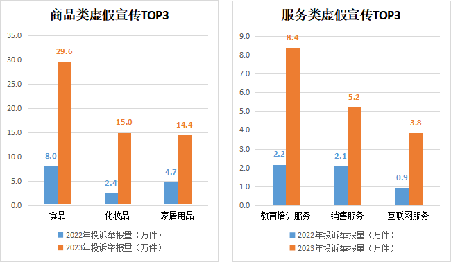 消費(fèi)者在購物時會接觸到各種各樣的宣傳信息,但海量的宣傳信息并非都是真實(shí)可信的,一些商家以夸大其詞、隱瞞真相等手段,誘使消費(fèi)者做出錯誤的消費(fèi)選擇。2023年,全國12315平臺接收虛假宣傳投訴舉報(bào)144.3萬件,同比增長1.7倍。從商品服務(wù)類別來看,商品類別中虛假宣傳投訴舉報(bào)較多的有食品(29.6萬件)、化妝品(15萬件)、家居用品(14.4萬件);服務(wù)類別中虛假宣傳投訴舉報(bào)較多的有教育培訓(xùn)服務(wù)(8.4萬件)、銷售服務(wù)(5.2萬件)、互聯(lián)網(wǎng)服務(wù)(3.8萬件)。消費(fèi)者反映的問題主要集中在商家虛構(gòu)產(chǎn)品效果、夸大產(chǎn)品優(yōu)勢,通過“好評返現(xiàn)”提高虛假聲譽(yù),誤導(dǎo)消費(fèi)者購買等。