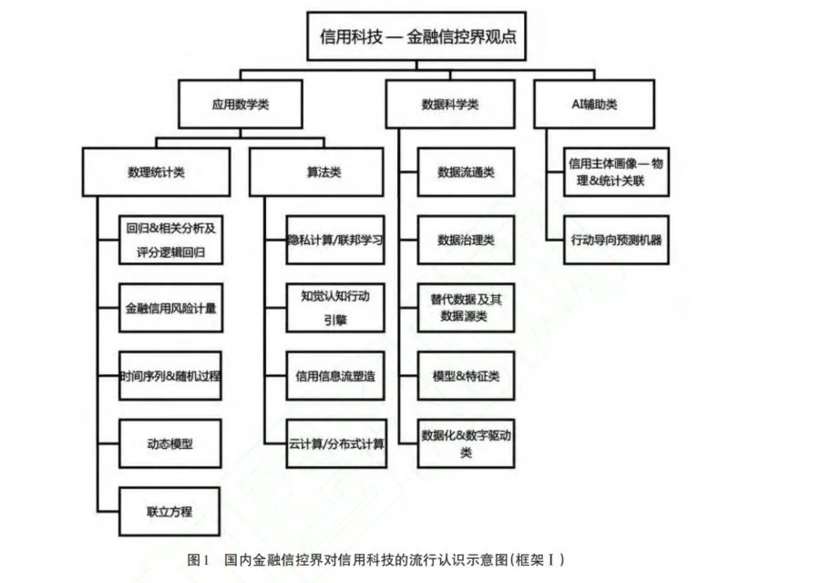 不少金融界人士認(rèn)為,信用科技是金融科技的組成部分,信用科技源于金融科技,信用科技的提法是由金融信控界提出的。例如,在中國(guó)人民銀行科技司的支持下,北京大學(xué)金融智能研究中心的學(xué)者們組織了一個(gè)“金融科技理論與應(yīng)用研究小組”,于2021年3月出版了一冊(cè)名為《金融科技知識(shí)圖譜》的“金融科技百科全書”,該書目錄中第三章的標(biāo)題就是“信用科技”,該項(xiàng)下共有21個(gè)條目。通過(guò)總結(jié)近年來(lái)金融信控界對(duì)信用科技的看法,我們可將其對(duì)“信用科技”框架的認(rèn)知描述如下(見圖1)。