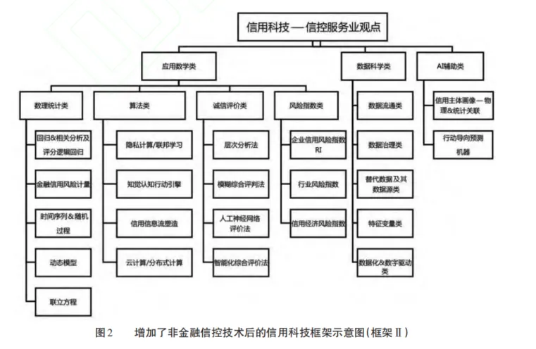 對(duì)于信用科技框架內(nèi)應(yīng)該包含什么樣的技術(shù)和工具,信控服務(wù)業(yè)考慮更為廣泛,特別是其中的征信、信用評(píng)級(jí)和誠(chéng)信評(píng)價(jià)等行業(yè)分支。該行業(yè)的服務(wù)業(yè)者認(rèn)為,應(yīng)該將一些非金融的信控技術(shù)和工具納入信用科技框架,其觀點(diǎn)如圖2所描述。