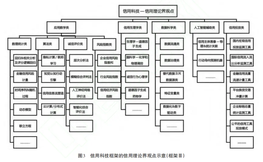 他們認(rèn)為信用科技框架內(nèi)應(yīng)包括:(1)能對(duì)信用風(fēng)險(xiǎn)進(jìn)行量化評(píng)估的技術(shù);(2)能阻止受信人做出失信決定的矯正方法。其觀點(diǎn)如圖3所示。