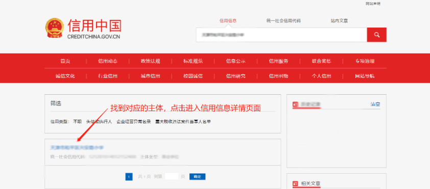 二、在查詢結(jié)果里找到對(duì)應(yīng)的主體,點(diǎn)擊進(jìn)入信用信息詳情頁(yè)面。