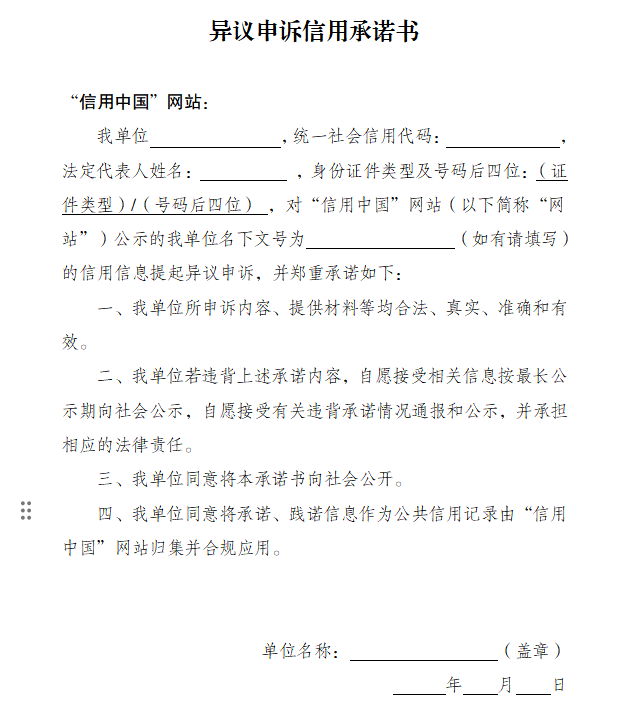 △異議申訴信用承諾書模板