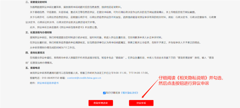 四、根據(jù)網(wǎng)頁(yè)指引,在詳細(xì)閱讀異議申訴流程,并下載《異議申訴信用承諾書》附件后,勾選最下方“我已仔細(xì)閱讀《相關(guān)隱私說明》”,然后點(diǎn)擊“異議申訴”按鈕進(jìn)入異議申訴界面