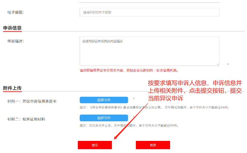 六、按要求填寫申訴人信息,申訴信息并上傳相關(guān)附件,點(diǎn)擊提交按鈕,提交當(dāng)前異議申訴。