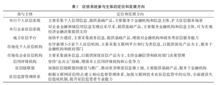 三是通過將央行征信系統(tǒng)和地方征信平臺定位為以提供基礎(chǔ)征信產(chǎn)品為主,市場化征信機構(gòu)則發(fā)揮科技集群和數(shù)據(jù)挖掘優(yōu)勢,結(jié)合市場化需求,提供深度化征信增值產(chǎn)品,增加征信有效供給,實現(xiàn)“征信產(chǎn)品全覆蓋”。