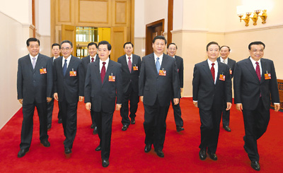 3月5日,第十二屆全國人民代表大會第一次會議在北京人民大會堂開幕。這是胡錦濤、習近平、吳邦國、溫家寶、賈慶林、李克強、張德江、俞正聲、劉云山、王岐山、張高麗等步入會場。新華社記者 蘭紅光 攝
