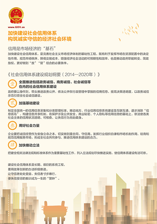 會(huì)議原則通過《社會(huì)信用體系建設(shè)規(guī)劃綱要(2014—2020年)》,并要求:一是全面推進(jìn)包括政務(wù)誠(chéng)信、商務(wù)誠(chéng)信、社會(huì)誠(chéng)信等在內(nèi)的社會(huì)信用體系建設(shè)。政府要以身作則,帶頭推進(jìn)政務(wù)公開,依法公開在行政管理中掌握的信用信息,提高決策透明度,以政務(wù)誠(chéng)信示范引領(lǐng)全社會(huì)誠(chéng)信建設(shè)。二是加強(qiáng)基礎(chǔ)建設(shè)。制定全國(guó)統(tǒng)一的信用信息采集和分類管理標(biāo)準(zhǔn),推動(dòng)地方、行業(yè)信用信息系統(tǒng)建設(shè)及互聯(lián)互通,逐步消除“信息孤島”,構(gòu)建信息共享機(jī)制,在保護(hù)涉及公共安全、商業(yè)秘密、個(gè)人隱私等信用信息的基礎(chǔ)上,依法使各類社會(huì)主體的信用狀況透明、可核查,讓失信行為無(wú)處藏身。三是用好社會(huì)力量。企業(yè)要把誠(chéng)信經(jīng)營(yíng)作為安身立命之本,切實(shí)做到重合同、守信用。發(fā)揮行業(yè)組織自律和市場(chǎng)機(jī)制作用,培育和規(guī)范信用服務(wù)市場(chǎng),形成全社會(huì)共同參與、推進(jìn)信用體系建設(shè)的合力。四是加快推動(dòng)立法。把健全相關(guān)法律法規(guī)和標(biāo)準(zhǔn)體系作為重要基礎(chǔ)性工作,列入立法規(guī)劃盡快推進(jìn)實(shí)施,使信用體系建設(shè)有法可依。