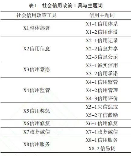 通過詞頻分析、內(nèi)容歸納等方法,從具有演進變化特征的社會信用政策文獻中提取16項信用主題詞和8項信用政策工具,分別以Xi和Xi-j進行編碼,結(jié)果如表1所示。篇幅所限,原始信用關(guān)鍵詞和詞頻分布予以省略。