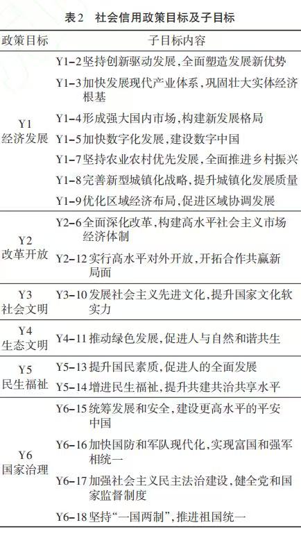 政策目標(biāo)是政策制定與政策執(zhí)行的預(yù)期結(jié)果,規(guī)定著政策工具的使用目的。鑒于社會信用政策的目標(biāo)不限于推動信用行業(yè)的發(fā)展,更多的是,通過其應(yīng)用推動我國整體宏觀經(jīng)濟社會的發(fā)展。因此,本文從《中華人民共和國國民經(jīng)濟和社會發(fā)展第十四個五年規(guī)劃和2035年遠景目標(biāo)綱要》(以下簡稱“十四五”規(guī)劃)對我國經(jīng)濟社會發(fā)展設(shè)定的主要目標(biāo)中提取出6個政策目標(biāo),作為對社會信用政策目標(biāo)的基本分析起點。這6個政策目標(biāo)是:經(jīng)濟發(fā)展、改革開放、社會文明、生態(tài)文明、民生福祉、國家治理。以“十四五”規(guī)劃中的“篇”為單位,根據(jù)社會信用政策的作用領(lǐng)域?qū)⑵渚幋a到“十四五”規(guī)劃具體小節(jié)的政策目標(biāo),編碼結(jié)果見表2。篇幅所限,具體到小節(jié)的編碼予以省略。