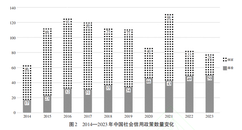 在政策時間窗口方面,我國雖然在1999年就提出了社會信用體系的概念,但是鑒于我國社會信用體系建設(shè)進入快車道起始于2014年《規(guī)劃綱要》的發(fā)布,本文對社會信用政策的研究時間窗口限定為2014—2023年的10年期間。