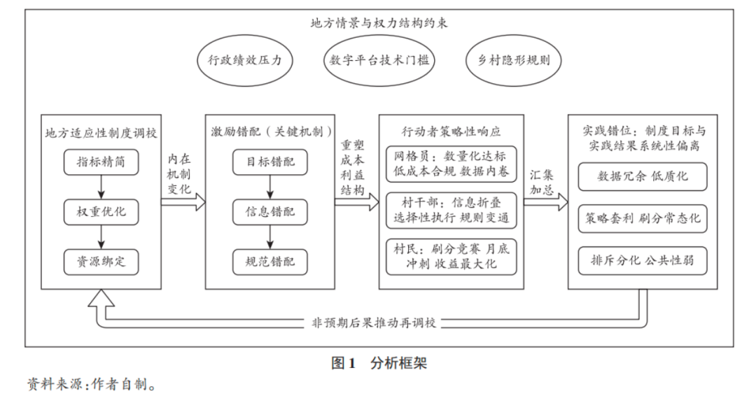 首先,制度激勵層是指圍繞積分指標(biāo)設(shè)置、權(quán)重分配與資源綁定所形成的正式規(guī)則組合,其作用在于重塑行動者的成本-收益結(jié)構(gòu)與信息環(huán)境。其次,行為策略層指村民、網(wǎng)格員與基層干部在上述激勵結(jié)構(gòu)下形成的合規(guī)、應(yīng)付或機會主義策略行為,例如刷分競賽、信息折疊、績效應(yīng)付、規(guī)則變通等。最后,實踐結(jié)果層是這些策略行為在基層治理過程中持續(xù)疊加后所呈現(xiàn)出的可觀測后果,即制度運行末端與初始公共目標(biāo)之間的偏離,也就是本文所界定的“實踐錯位”。