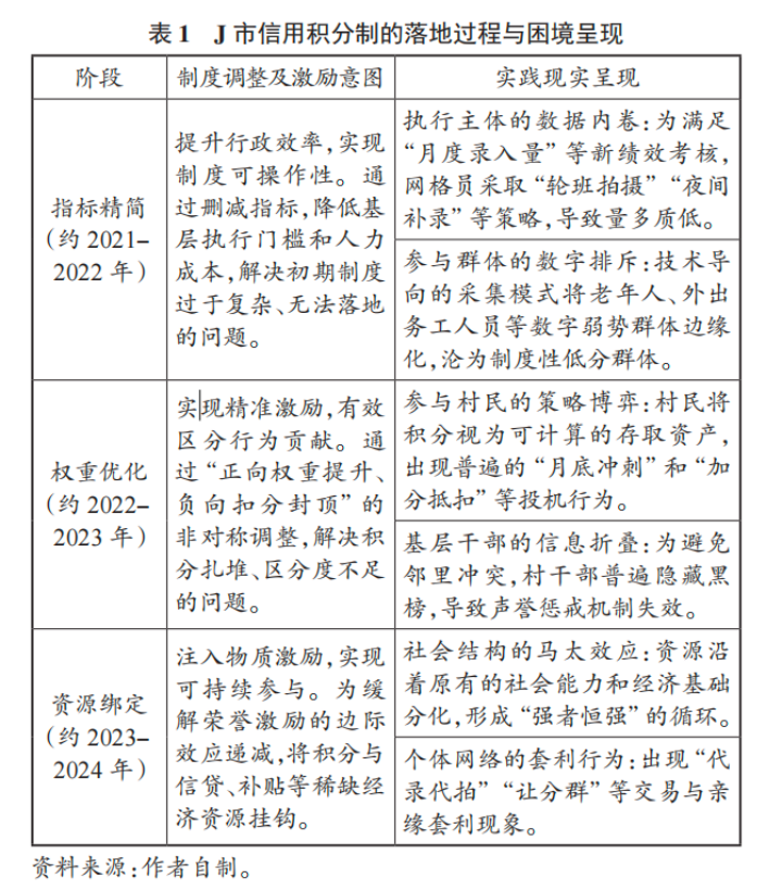 基于對J市信用積分制三年演化過程的持續(xù)田野追蹤,筆者發(fā)現(xiàn):當(dāng)理性化、技術(shù)化的積分藍圖經(jīng)由地方政府的詮釋和執(zhí)行,自上而下傳導(dǎo)至縣、鄉(xiāng)、村后,其內(nèi)在激勵結(jié)構(gòu)常常與鄉(xiāng)村治理場域既有的情感邏輯、文化習(xí)慣與資源約束發(fā)生碰撞,進而誘發(fā)策略性合規(guī)、隱性抵制、技術(shù)規(guī)避乃至規(guī)則再造等多重響應(yīng),最終導(dǎo)致制度目標(biāo)與實踐結(jié)果之間的系統(tǒng)性偏離。由此引出本文的研究問題:一套本該克服搭便車?yán)Ь场U大公共合作供給的激勵工具,是如何在與隱性的考核壓力、信息不對稱和鄉(xiāng)土規(guī)范的碰撞中被行動者重新計算與策略化利用,從而在集體行動層面生成新的合作困境?